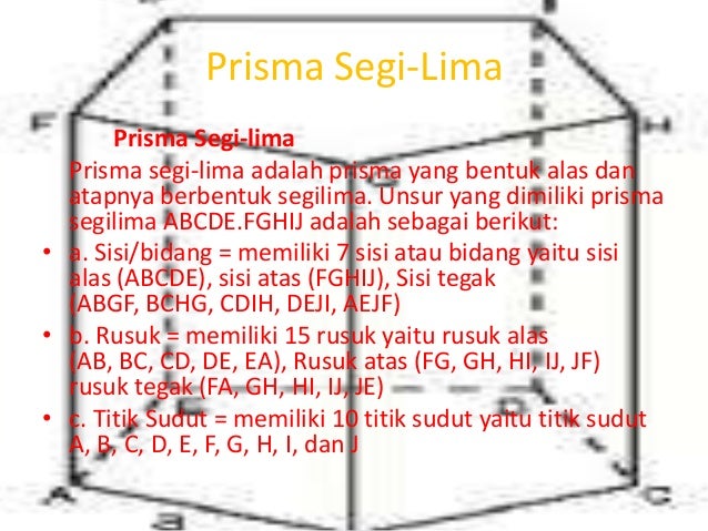 Related : Bentuk Prisma Segi Lima : Sisi/bidang = memiliki 7 sisi atau bidang yaitu sisi alas (abcde), sisi atas (fghij), sisi tegak (abgf, bchg, cdih, deji, aejf)..